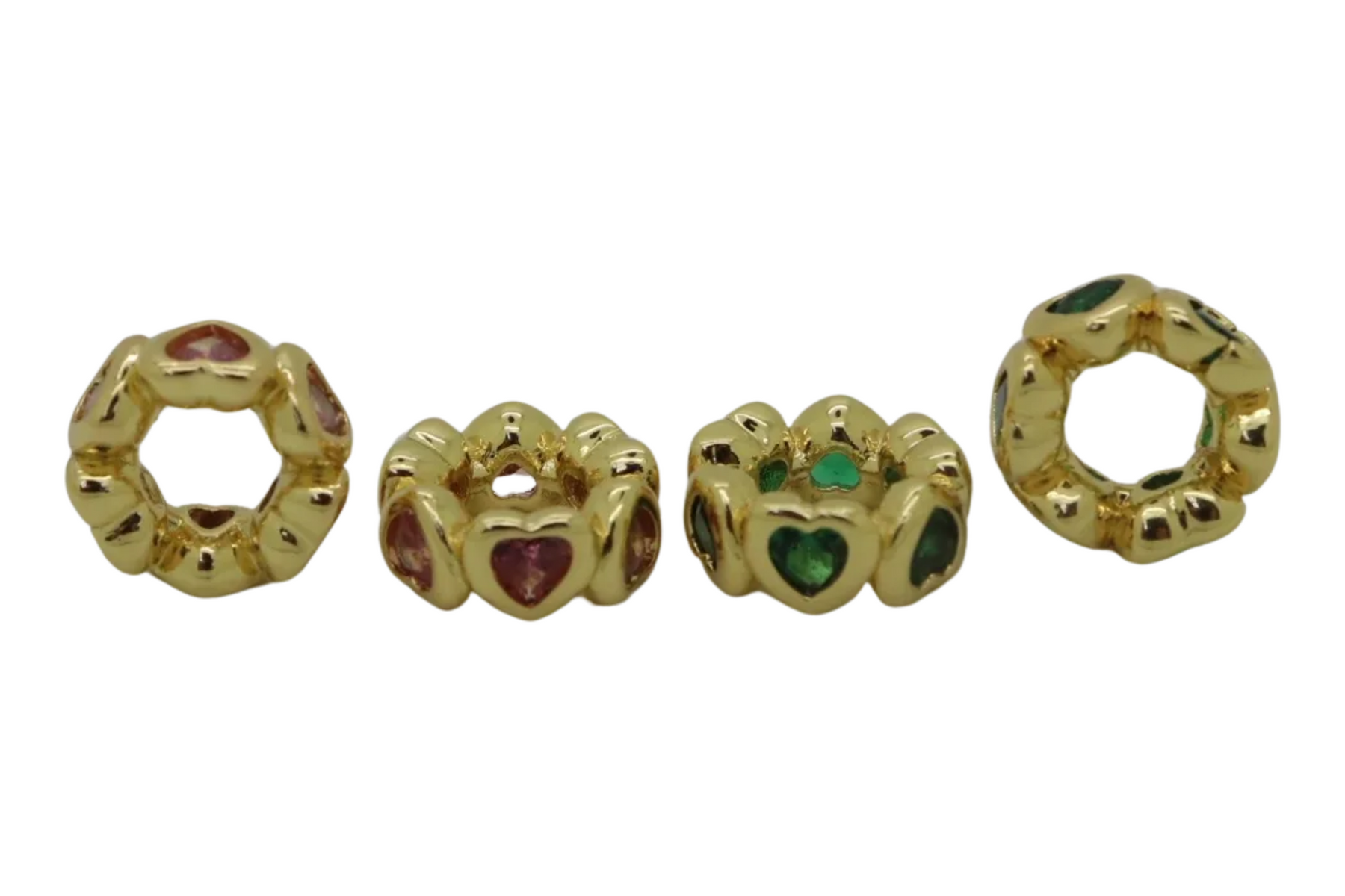 These are 18kt gold-plated heart-shaped spacer beads with colorful enamel inlays. The set includes hearts in white, teal, pink, and lime green, each outlined in a polished gold-plated border. The vibrant colors make these spacers ideal for adding a playful and stylish accent to jewelry pieces, such as bracelets or necklaces. These beads bring a pop of color and a modern flair to any jewelry design, making them perfect for fun, casual, or personalized creations.