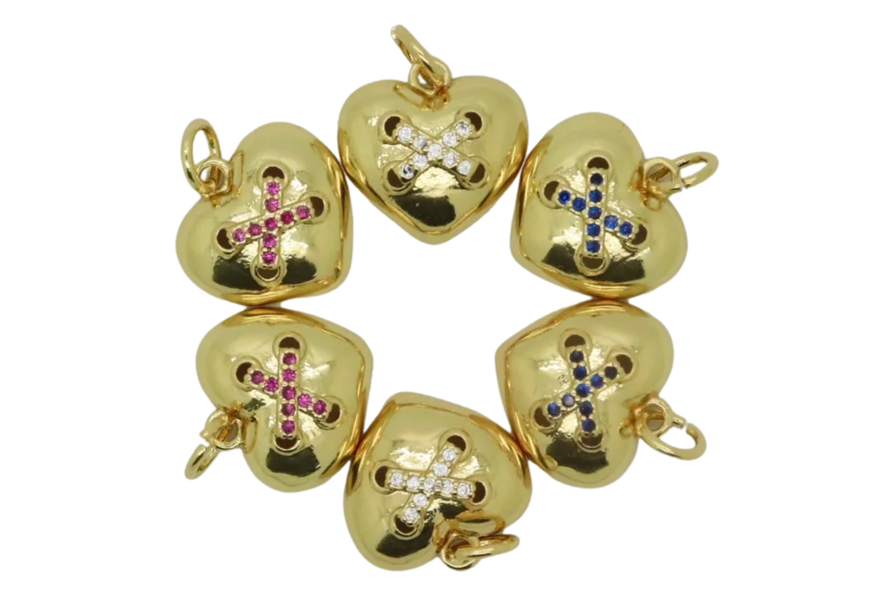 These are 18kt gold-plated heart-shaped spacer beads with colorful enamel inlays. The vibrant colors make these pendants ideal for adding a playful and stylish accent to jewelry pieces, such as bracelets or necklaces.